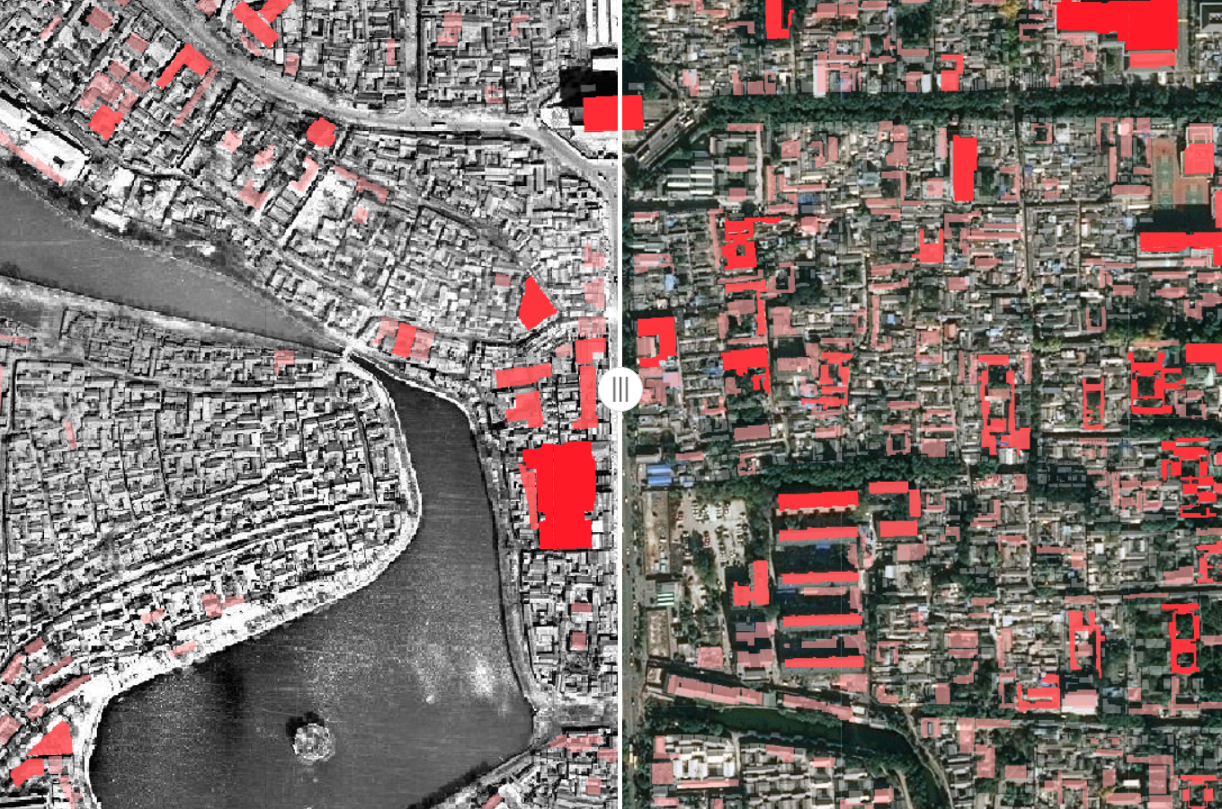 除此之外, 经过精确地理标记处理后的历史航拍, 可以如时光机一般, 带会我们永远失去的古城, 和夺走她的每一把镰刀和铁锤.